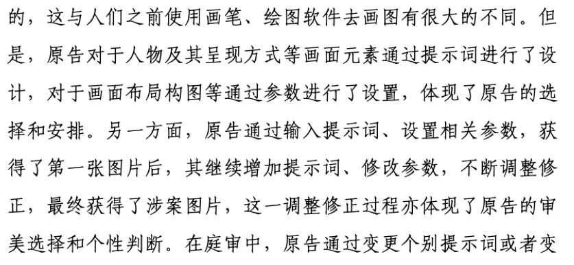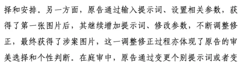 原告对于人物及其呈现方式等画面元素通过提示词进行了设计,对于画面布局构图等通过参数进行了设置,体现了原告的选择和安排。另一方面,原告通过输入提示词、设置相关参数,获得了第一张图片后,其继续增加提示词、修改参数,不断调整修正,最终获得了涉案图片,这一调整修正过程亦体现了原告的审美选择和个性判断。