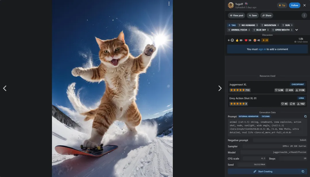 Steps: 20, VAE: sdxl_vae.safetensors, Size: 832x1216, Seed: 562327064, Model: juggernautXL_v7Rundiffusion, Version: v1.6.0-2-g4afaaf8a, Sampler: DPM++ 2M SDE Karras, VAE hash: b3165c12ca, CFG scale: 4.5, Model hash: 0724518c6b, “EnvyActionShotXL01: 46f3acce826a, xl_more_art-full_v1: fe3b4816be83”
