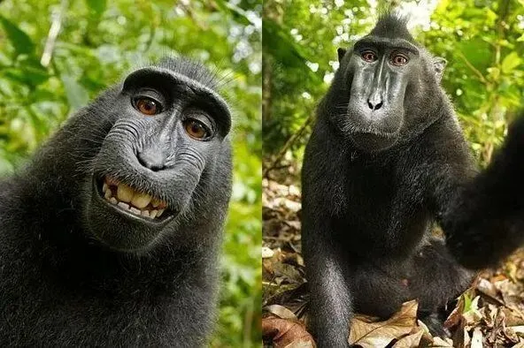 2011年,英国摄影师David Slater在印尼野外进行拍摄活动,在拍摄期间他使用三脚架固定相机,并故意离开遥控快门,让黑猴能接近相机。一只母黑猴按下了遥控快门,拍摄了大量照片,其中 大多数照片模糊不清,不能使用 ,但Slater在其中 挑选 出了最有趣的两张照片,随后网站上发布了它们:
