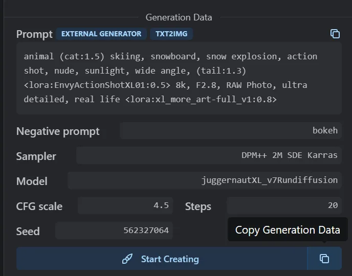 在知名AI模型分享网站Civitai中,有大量用户分享的AI图像。这些图像都会包含了具体使用的模型(Resources )以及生成时所使用的参数(Generation Data),网站还提供了“一键复制”参数的功能。