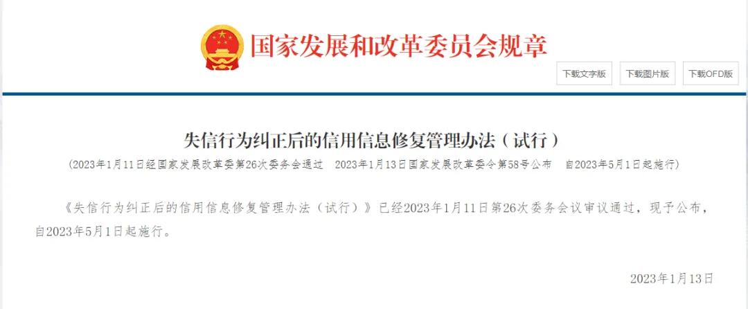 2019年国务院印发《关于加快推进社会信用体系建设构建以信用为基础的新型监管机制的指导意见》就提出,要探索建立信用修复机制。2021年8月1日,国家市场监管总局公布《市场监督管理严重违法失信名单管理办法》、《市场监督管理行政处罚信息公示规定》、《市场监督管理信用修复管理办法》等3个部门规章和规范性文件,自2021年9月1日起施行。2023年1月11日国家发展和改革委员会出台《失信行为纠正后的信用信息修复管理办法(试行)》(以下简称“《办法》”),自2023年5月1日起实施。
