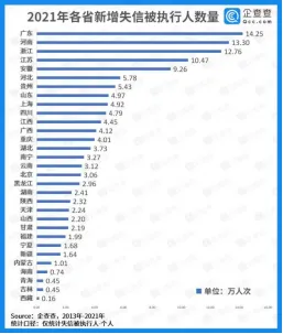 可见,失信被执行人数量新增最多的为广东、河南、浙江,新增最少的为西藏、吉林、青海,该数量的增长与经济发展程度及活跃度有关。