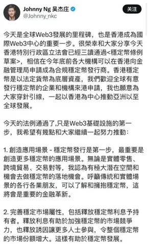 , 点击链接跳转我们关于该法案的文章)关键程序性投票。要求稳定币发行方必须100%储备高质量、低风险的流动性资产,为稳定币的价值稳定提供了坚实的物质基础。香港此次条例的通过,也体现香港与全球稳定币监管趋势保持一致,正如香港立法会议院吴杰庄所说,《条例》的出台是全球Web3发展的里程碑,也是香港成为国际Web3中心的重要一步。