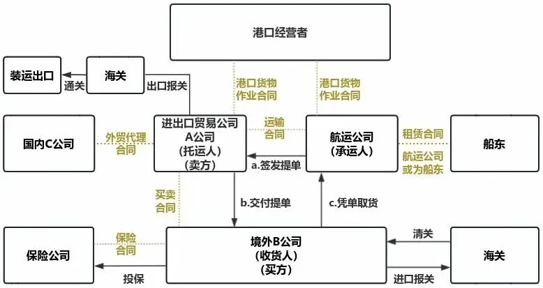 通过上图可以看出,在国际贸易交易中,最常见的贸易角色主要分为两类,一是贸易参与人 ,其以商业主体身份参与国际贸易交易,如进出口贸易公司、货运代理、船舶代理、航运公司、船东、保险公司、港口经营人等;二是监管参与人 ,是履行进出口贸易监督、管理职责的机关,如海关、港口行政管理部门等。