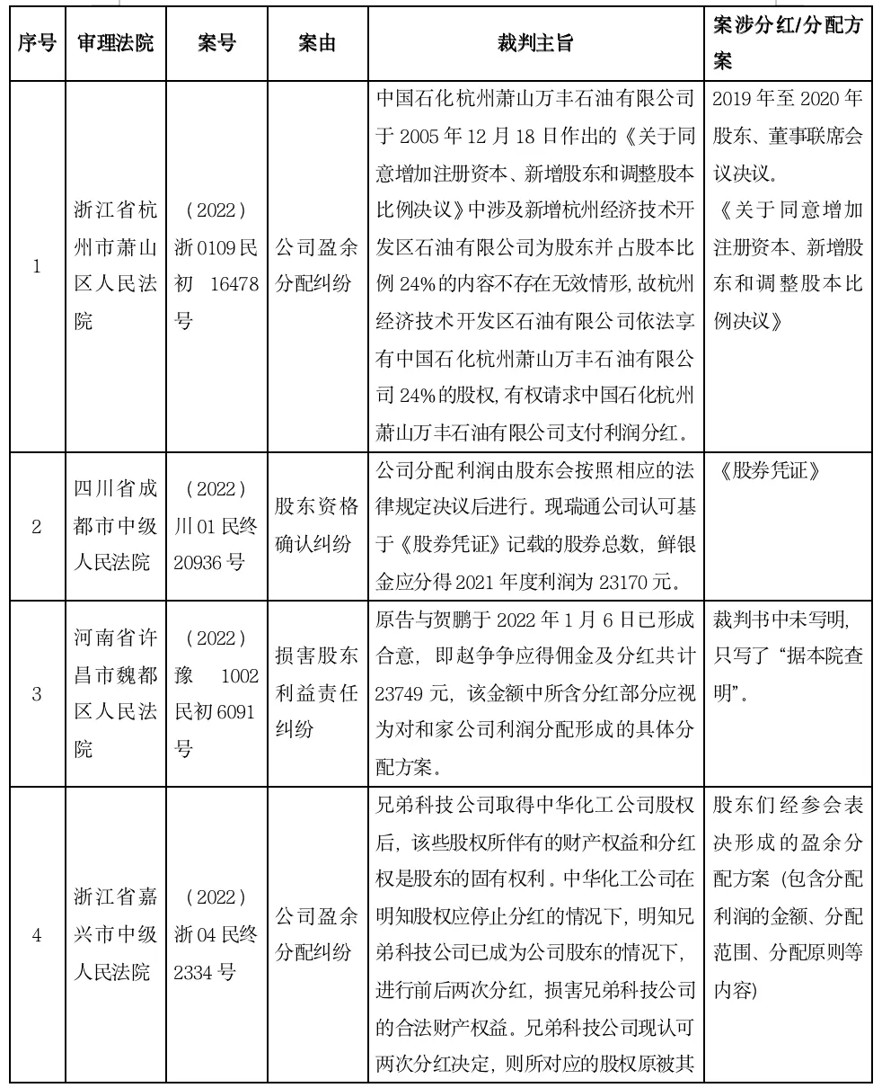 笔者通过“威科先行”法律数据库平台,检索了截至2023年4月24日止的,与《公司法司法解释(四)》第15条所关联的全部82份裁判文书。在剔除二审等重复案例、争议焦点与利润分配无关的案例后,最终得到了72份文书作为分析样本(以下简称“相关案例”)。