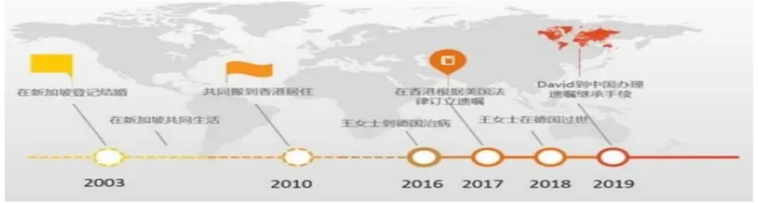 王女士是中国籍公民,David是美国籍公民,两人在新加坡工作期间相识相恋,于2003年在新加坡登记结婚。王女士和David实力相当,都是精英人士,两人结婚时签署婚前协议一份,约定婚后实行财产AA制,登记在各自名下的财产归属于各自所有。2010年,俩人离开新加坡,共同前往中国香港工作、生活。2015年,王女士被确诊患了癌症,从2016年开始,陆续到德国接受治疗,2018年不幸在德国过世。