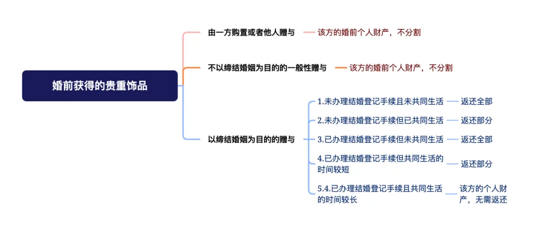 作为结婚彩礼为一方购置的贵重饰品,可以参照彩礼的相关法律规定处理。立法者将共同生活、是否登记结婚、彩礼给付是否致使给付方生活困难作为彩礼返还比例的考量因素。在司法实践中确定彩礼返还比例时,如果双方共同生活时间越长,彩礼返还比例越低;相反没有共同生活的,原则上彩礼受赠一方应当全额返还彩礼。同时兼顾考虑哪一方主动悔婚、是否存在过错、有无妊娠生育子女等现实情况。根据现行法律规定,以缔结婚姻为目的的赠与可分为以下四种情形:
