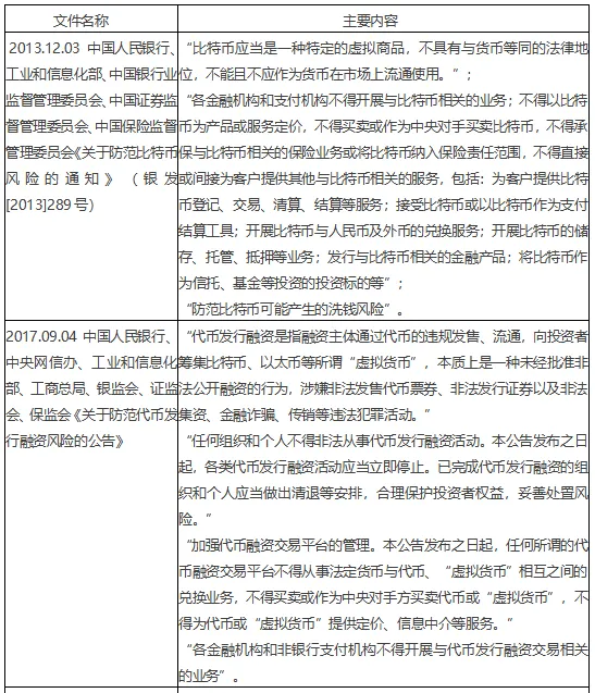 该阶段的主要基础法律为2016年11月7日颁布、2017年6月1日实施的《网络安全法》。在此期间,多部门三次联合发文,对比特币、虚拟货币相关问题作出了具体、明确的规范和指引,充分体现“从严监管、严格限制”的政策取向。中国互联网金融协会也出台了行业相关自律性文件。主要内容如下: