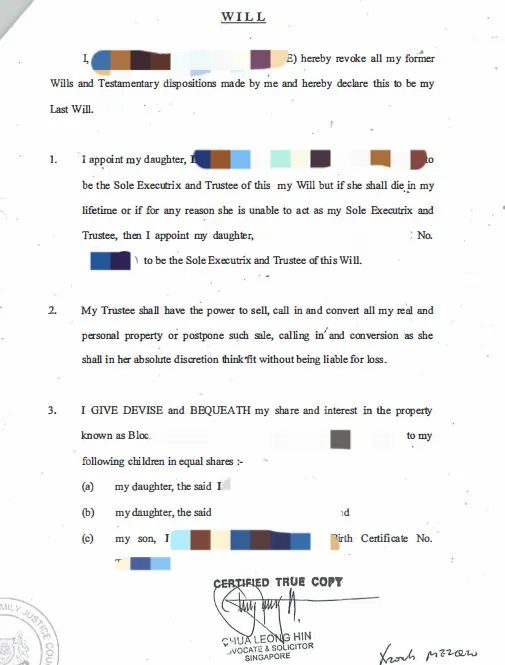 The testament clearly specified in sequence: the executor candidate and replacement, the executor’s authority and duties, ownership and shares of Singapore property, ownership and shares of global bank deposits, and ownership and shares of other global property. A single testament, just a few hundred words, attempting to handle property types across different legal jurisdictions presented considerable difficulties in subsequent practical operations.