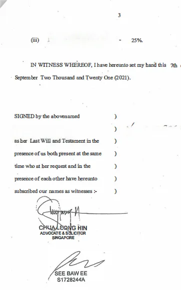 另根据新加坡《遗嘱法》第6条之规定,遗嘱为书面文件,被继承人于遗嘱末尾签署,并在两位非受益人见证人同时在场的情况下签署,两位见证人亦分别在被继承人及彼此面前签名确认,该份遗嘱的形式要件符合新加坡法律。该份遗嘱实为两位律师根据被继承人的意愿打印形成,又根据我国《民法典》第1136条之规定,打印遗嘱应当有两个以上见证人在场见证,遗嘱人和见证人应当在遗嘱每一页签名,注明年、月、日。而该份遗嘱并未有见证人在每一页遗嘱上进行签署,也并未注明年月日,如果严格依照我国法律的话,该份遗嘱的形式不符合打印遗嘱的要件,也不符合其他形式的遗嘱,形式上不成立。综合分析来看,该份遗嘱的形式要件符合新加坡法律的规定,因此得以成立。