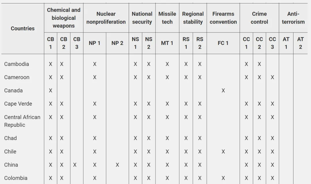 图表 2如图示,打“×”为该国家/地区适用的受控原因。举例,若管控物项在CCL清单上管控原因是国家安全,则该物项在出口至中国时需要事先申请许可证,但若出口至加拿大,则无需申请许可证。