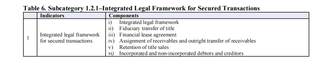 在此部分中,就如何衡量担保交易的统一法律框架,新营商环境评估项目指出6点:统一法律框架、让与担保、融资租赁、应收账款的保理和实质转让、所有权保留买卖、企业法人与非企业法人的债务人和债权人。