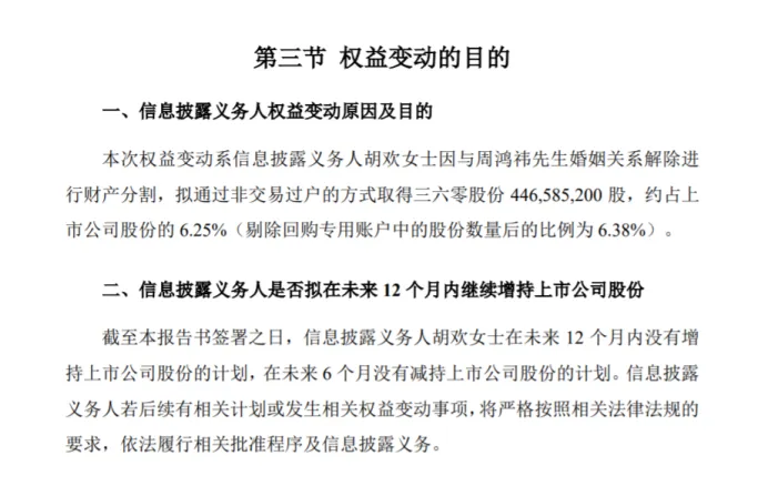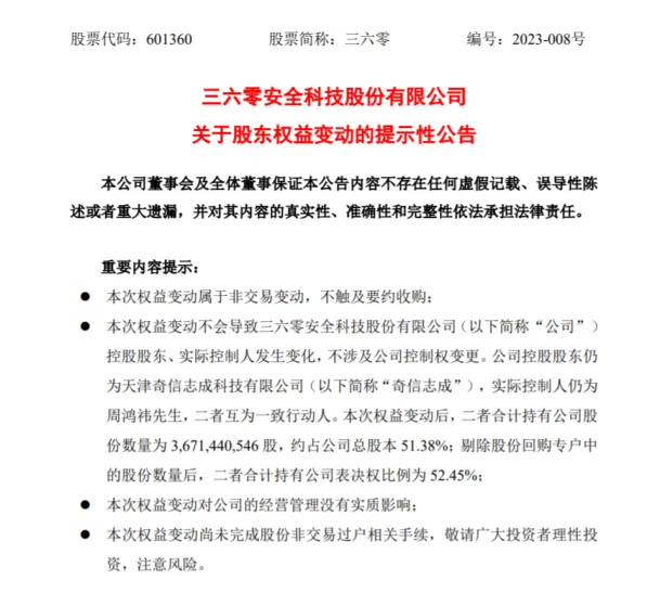 4月4日收盘后,三六零(SH601360)发布关于股东权益变动的提示性公告,公司实际控制人周鸿祎与胡欢经友好协商,已办理解除婚姻关系手续,并就股份分割等事宜作出相关安排。周鸿祎拟将其直接持有的公司6.25%股份分割至胡欢名下。本次权益变动不会导致公司控股股东、实际控制人发生变化,不涉及公司控制权变更。